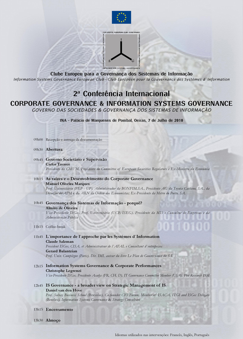Dada a grande importância que a Informação e os Sistemas de Informação têm no domínio do Governo das Sociedades, o ceGSI - Clube Europeu para a GOVERNANÇA DOS SISTEMAS DE INFORMAÇÃO / ISGec - INFORMATION SYSTEMS GOVERNANCE European Club / ceGSI - Club Europeen pour les Systèmes d’Information vai realizar no próximo dia 7 de Julho, a 2ª Conferência Internacional, em Portugal, subordinada ao tema: